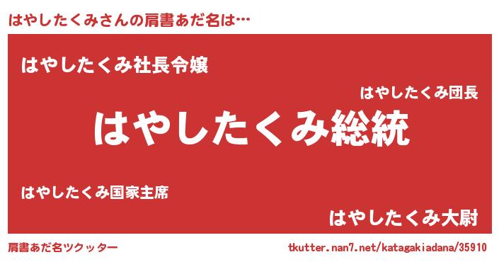 | 男性向けラノベタイトル風あだ名 | 『Re:はやしたくみから始める異世界生活』 |