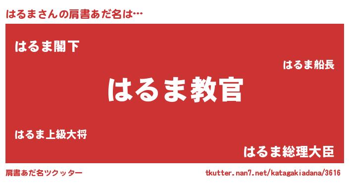 | 男性向けラノベタイトル風あだ名 | 『この素晴らしい世界にはるまを!』 |