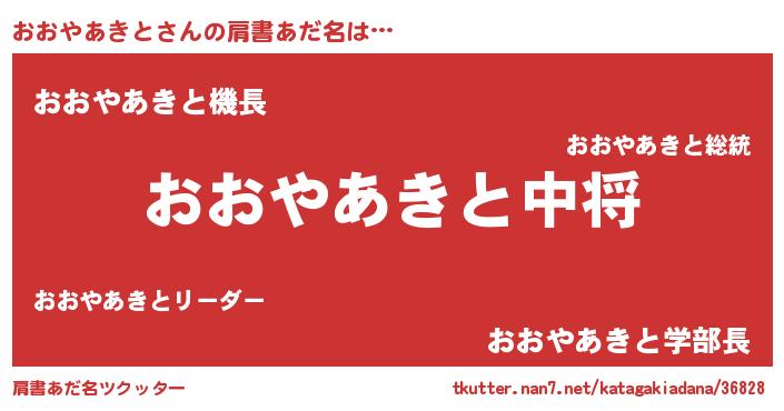 | 男性向けラノベタイトル風あだ名 | 『おおやあきと~年齢イコール彼女いない歴の魔法使い~』 |