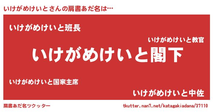 | 男性向けラノベタイトル風あだ名 | 『Re:いけがめけいとから始める異世界生活』 |