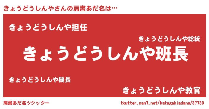 | 男性向けラノベタイトル風あだ名 | 『きょうどうしんやの嫁は女の子じゃないと思った?』 |