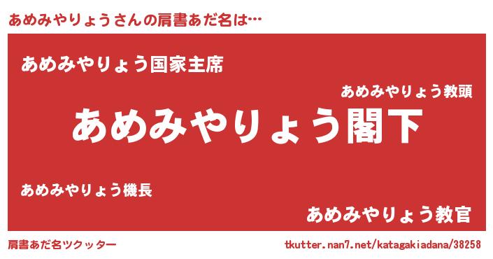 | 男性向けラノベタイトル風あだ名 | 『Re:あめみやりょうから始める異世界生活』 |