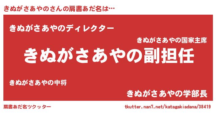 | 女子向けラノベタイトル風あだ名 | 『異世界で失敗しない100のきぬがさあやの』 |