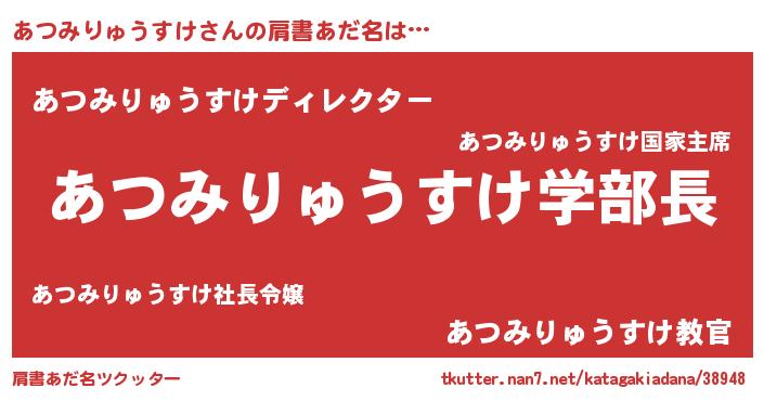 | 男性向けラノベタイトル風あだ名 | 『おまえをオタクにしてやるから、俺をあつみりゅうすけにしてくれ! 』 |
