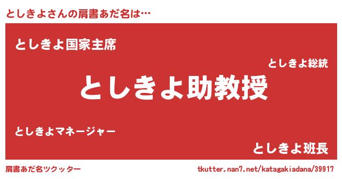 | 女子向けラノベタイトル風あだ名 | 『死神としきよの再婚』『闇のとしきよ』 |