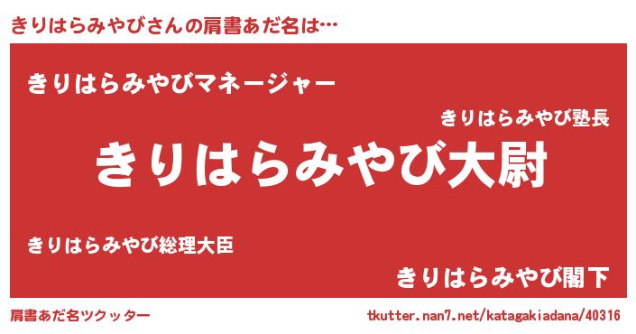 | 恥ずかしいあだ名 | 『キリハラミヤビデラックス』『きりちん』 |