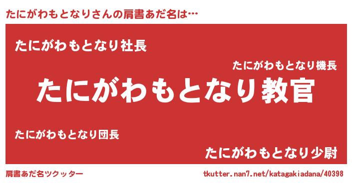 | 男性向けラノベタイトル風あだ名 | 『この素晴らしい世界にたにがわもとなりを!』 |