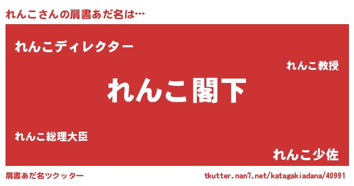 | 男性向けラノベタイトル風あだ名 | 『Re:れんこから始める異世界生活』 |