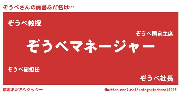 | 男性向けラノベタイトル風あだ名 | 『ぞうべに滅ぼされるだけの簡単なお仕事です』 |
