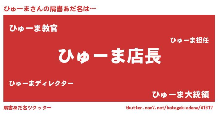 | 男性向けラノベタイトル風あだ名 | 『ひゅーまの憂鬱』『魔弾の王とひゅーま』 |