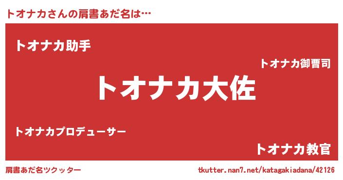 | 男性向けラノベタイトル風あだ名 | 『転生したらトオナカだった件』 |