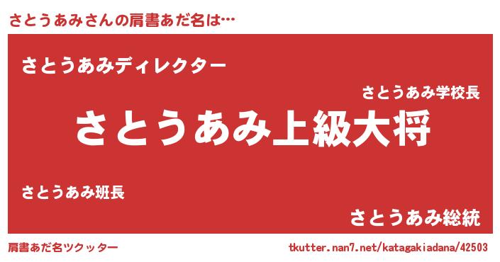 | 女子向けラノベタイトル風あだ名 | 『さとうあみの玉の輿計画!』 |