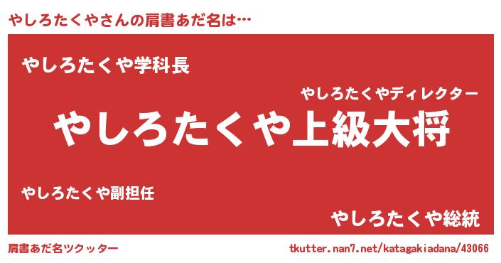 | 男性向けラノベタイトル風あだ名 | 『転生したらやしろたくやだった件』 |