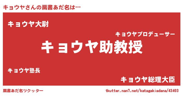 | ヒーロー風カッコイイあだ名 | 『慈愛の使者キョウヤ』『黄金騎士キョ』 |