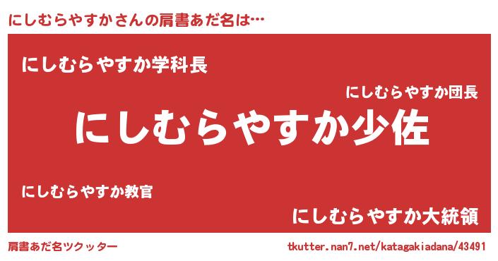 | 女子向けラノベタイトル風あだ名 | 『にしむらやすかの玉の輿計画!』 |