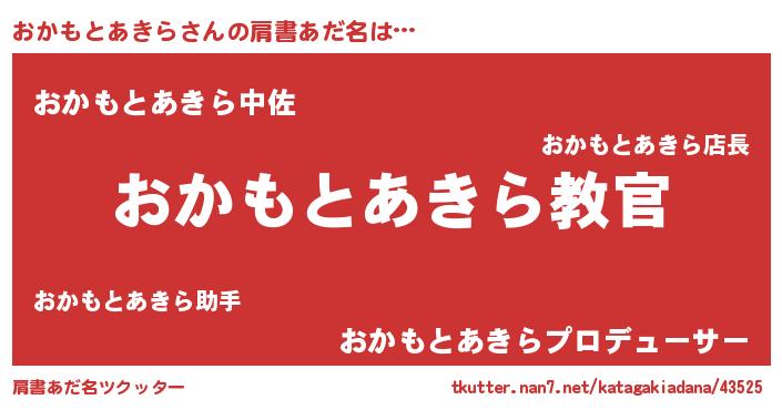 | 女子向けラノベタイトル風あだ名 | 『乙女ゲームの破滅フラグしかない悪役おかもとあきらに転生してしまった…』 |