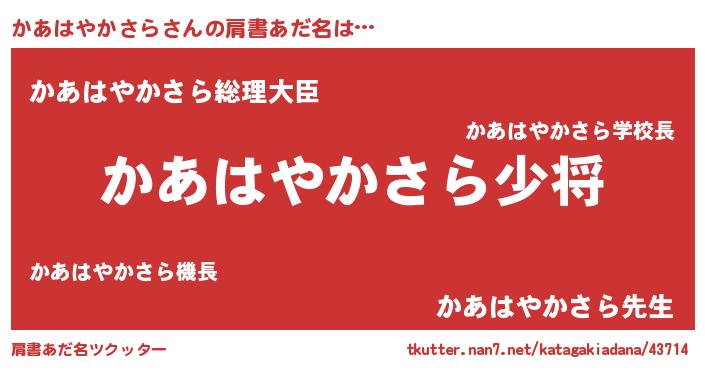 | 男性向けラノベタイトル風あだ名 | 『かあはやかさら~年齢イコール彼女いない歴の魔法使い~』 |