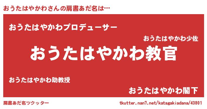| 男性向けラノベタイトル風あだ名 | 『この素晴らしい世界におうたはやかわを!』 |