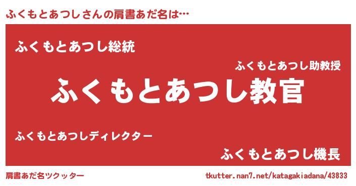 | 男性向けラノベタイトル風あだ名 | 『この素晴らしい世界にふくもとあつしを!』 |