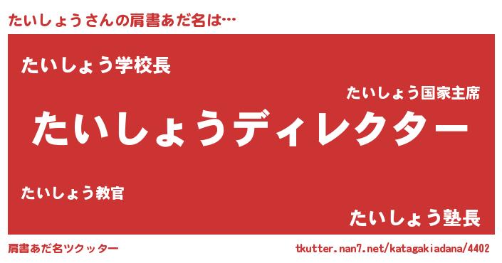 | 男性向けラノベタイトル風あだ名 | 『たいしょうに滅ぼされるだけの簡単なお仕事です』 |