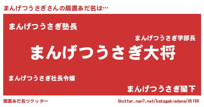 | 男性向けラノベタイトル風あだ名 | 『まんげつうさぎ~年齢イコール彼女いない歴の魔法使い~』 |
