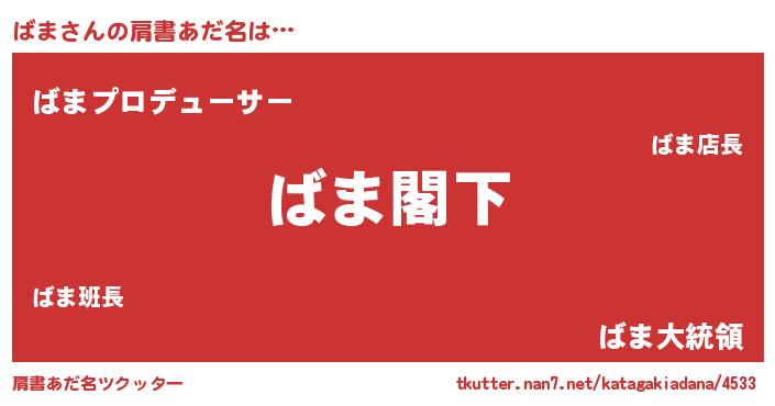 | 男性向けラノベタイトル風あだ名 | 『Re:ばまから始める異世界生活』 |