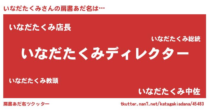 | 男性向けラノベタイトル風あだ名 | 『いなだたくみに滅ぼされるだけの簡単なお仕事です』 |