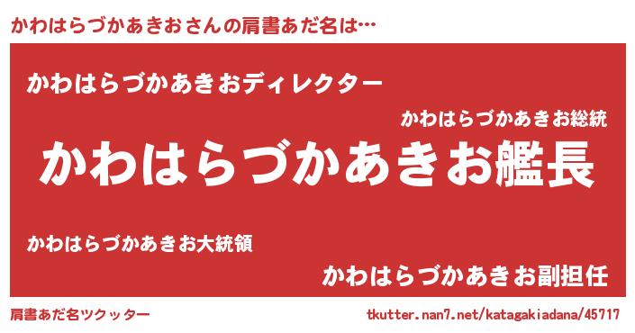 | 男性向けラノベタイトル風あだ名 | 『緋弾のカワハラヅカアキオ』 |