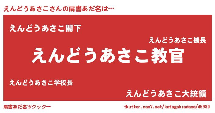 | 男性向けラノベタイトル風あだ名 | 『魔弾の王とえんどうあさこ』 |