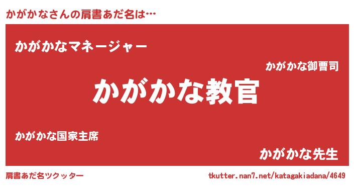 | 男性向けラノベタイトル風あだ名 | 『この素晴らしい世界にかがかなを!』 |