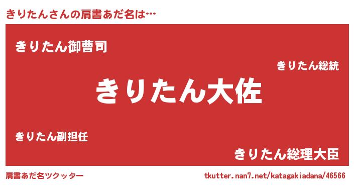 | 男性向けラノベタイトル風あだ名 | 『きりたん~年齢イコール彼女いない歴の魔法使い~』 |