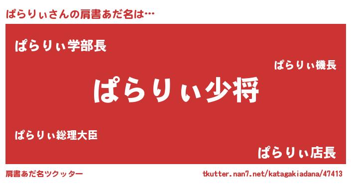 | 男性向けラノベタイトル風あだ名 | 『ぱらりぃ~年齢イコール彼女いない歴の魔法使い~』 |