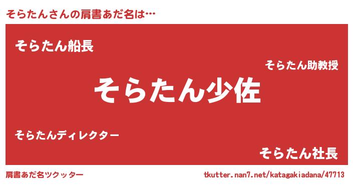 | 男性向けラノベタイトル風あだ名 | 『そらたん~年齢イコール彼女いない歴の魔法使い~』 |