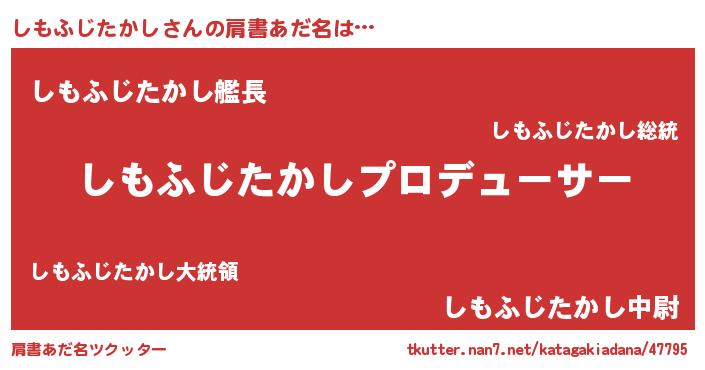 | 男性向けラノベタイトル風あだ名 | 『しもふじたかしに滅ぼされるだけの簡単なお仕事です』 |