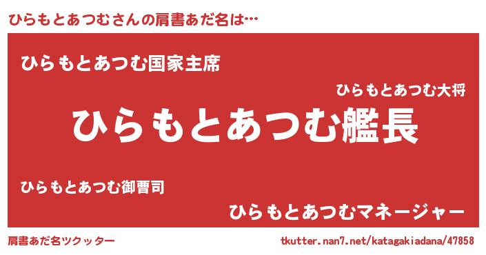 | 男性向けラノベタイトル風あだ名 | 『うちのひらもとあつむが世界を掌握している!』 |