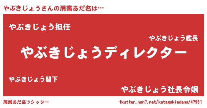 | 男性向けラノベタイトル風あだ名 | 『やぶきじょうに滅ぼされるだけの簡単なお仕事です』 |