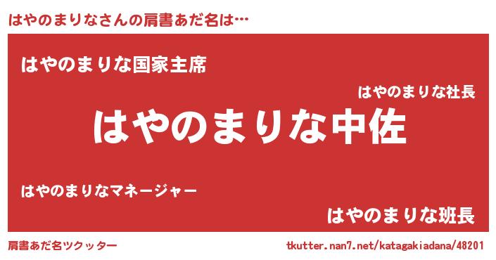 | 男性向けラノベタイトル風あだ名 | 『ハヤノマリナスレイヤー』 |