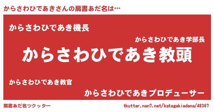 | ヒーロー風カッコイイあだ名 | 『ネオカラサワヒデアキ』『仮面カラダー』 |