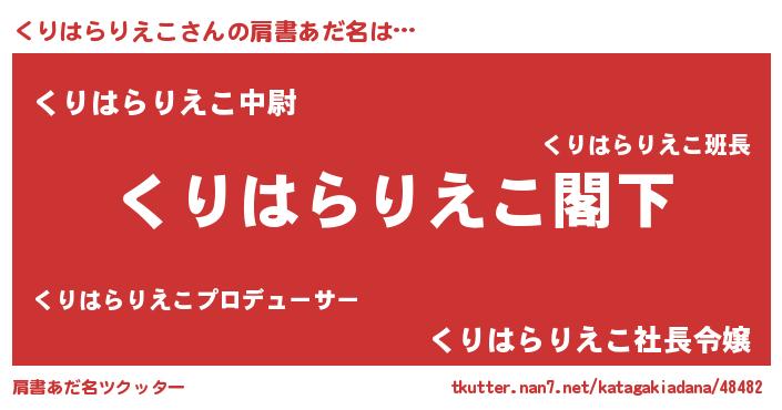 | 男性向けラノベタイトル風あだ名 | 『Re:くりはらりえこから始める異世界生活』 |