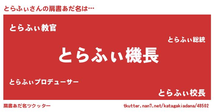 | 意味不明あだ名 | 『住所不定無職とらふぃ(98歳)』 |