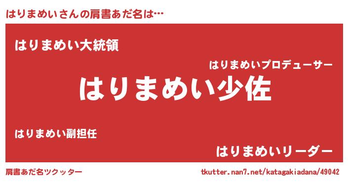 | 男性向けラノベタイトル風あだ名 | 『転生したらはりまめいだった件』 |