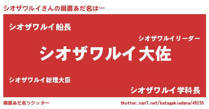 | 男性向けラノベタイトル風あだ名 | 『シオザワルイ~年齢イコール彼女いない歴の魔法使い~』 |