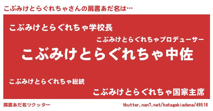 | 女子向けラノベタイトル風あだ名 | 『こぶみけとらぐれちゃの玉の輿計画!』 |