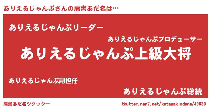 | 男性向けラノベタイトル風あだ名 | 『ありえるじゃんぷ~年齢イコール彼女いない歴の魔法使い~』 |