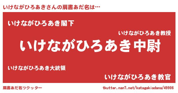 | 男性向けラノベタイトル風あだ名 | 『いけながひろあき~年齢イコール彼女いない歴の魔法使い~』 |