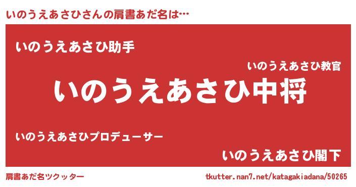 | 男性向けラノベタイトル風あだ名 | 『いのうえあさひ~年齢イコール彼女いない歴の魔法使い~』 |