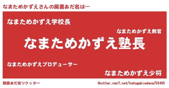 | 男性向けラノベタイトル風あだ名 | 『なまためかずえの嫁は女の子じゃないと思った?』 |