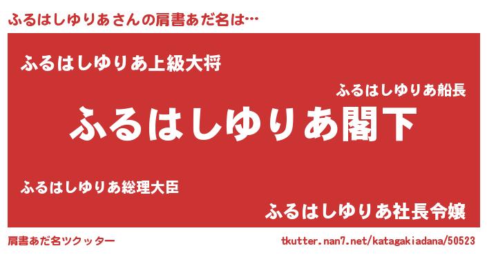 | 男性向けラノベタイトル風あだ名 | 『Re:ふるはしゆりあから始める異世界生活』 |