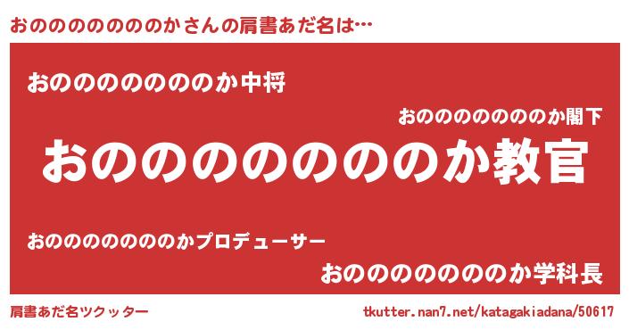 | 男性向けラノベタイトル風あだ名 | 『魔弾の王とおのののののののか』 |