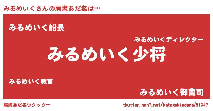 | 男性向けラノベタイトル風あだ名 | 『みるめいく~年齢イコール彼女いない歴の魔法使い~』 |